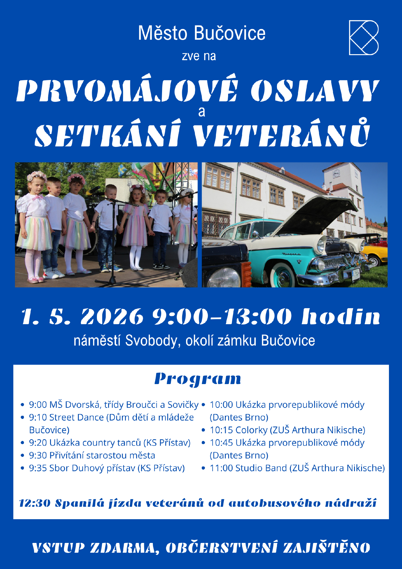 Stovky nablýskaných historických automobilů, motorek a jiných strojů, bohatý kulturní program a dobré jídlo a pití. To jsou Prvomájové oslavy se setkáním veteránů na náměstí Svobody a v okolí zámku v Bučovicích.
